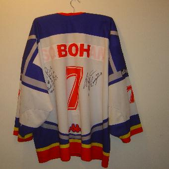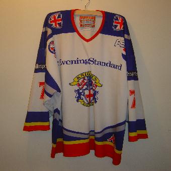 One of my favourite players to ever pull on a London jersey it was fantastic to get my hands on this one. Although it is dye sublimated and I am not a fan of those types of jerseys, it is undoubtedly one of my favourites. Originally worn by Lee Sorochan before he was traded to Jokerit and Aaron arrived, this jersey has "Boh" ironed on over the top of the dye sublimated original name bar reading "Sorochan". |
